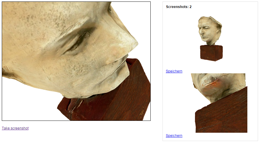 No lets move on, we only need a few bits of javascript to glue our app together. A function is triggered every time the user presses the button. This function calls the getScreenshot() function of the x3dom runtime and recieves a data URI containing the image. Afterwards a new image tag is created and the data link is set as source and as well as hyperref for the download link.