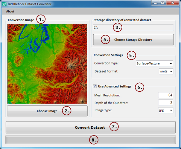 The BVHRefiner Dataset Converter is a tool to produce a WMTS or TREE conform dataset from single image. This is only a test application and can not handle arbitrary picture sizes.