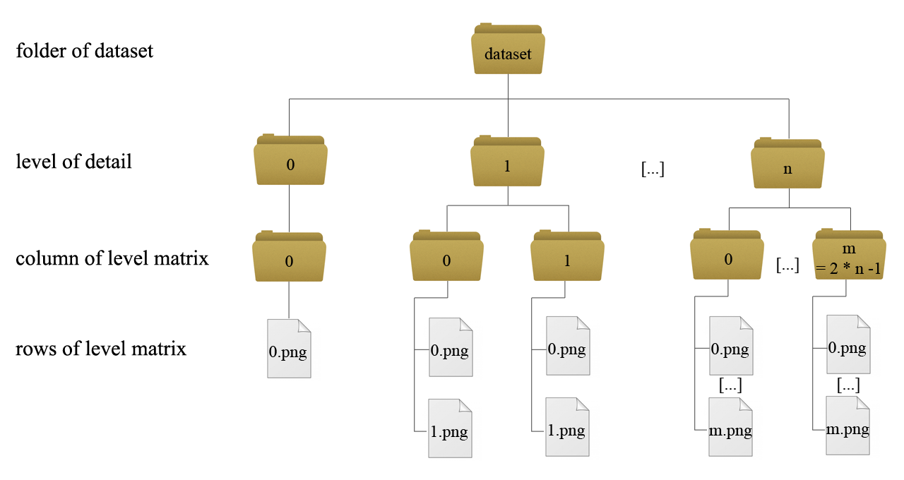 In WMTS a multidimensional dataset of a terrain can be integrated very easy. For every level of detail a new matrix of tiles is required. Every level has its own folder. So if you want to get five different levels of detail in your application, five folders must exist, numbered from 0 to 4. The detail from level to level grows up by a factor of four. Into the folders for the levels, subfolders that describe the columns of the matrix have to be inserted. On level 0 you only have one column, represented through the folder with the name 0. In the next level you have two columns named 0 and 1, growing up by a factor of two from level to level. In the subfolders you place the images that represent the tiles data. There must be as much images as subfolders. On level 0 you only have one image that represents the whole terrain data. On level one exist two subfolders. Every subfolder has to include two images, on the next level four per subfolder and so on. The following figure shows the addressing-scheme: