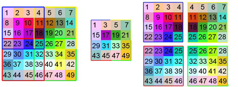 To reconstruct a 3D-Terrain from a WMTS conform dataset a special arrangement of the pixels in the images of the WMTS dataset is required. Neighboring tiles have to share the pixels on the boundaries. The figure on top of this subsection shows on the left the original image, in the middle the image of level 0 of the final dataset and on the right the four images of level 1. Furthermore the resolution of every image of the final dataset must be of the size 2n + 1, where n is the value of the size attribute of a tile in the BVHRefiner node. In the example of Puget Sound on top of this tutorial a value of ‘64 64’ is chosen for every tile as size attribute. So on the dataset, every image has to be of the size ‘129 129’. This is a condition for the algorithm to prevent cracks on the mesh representation.