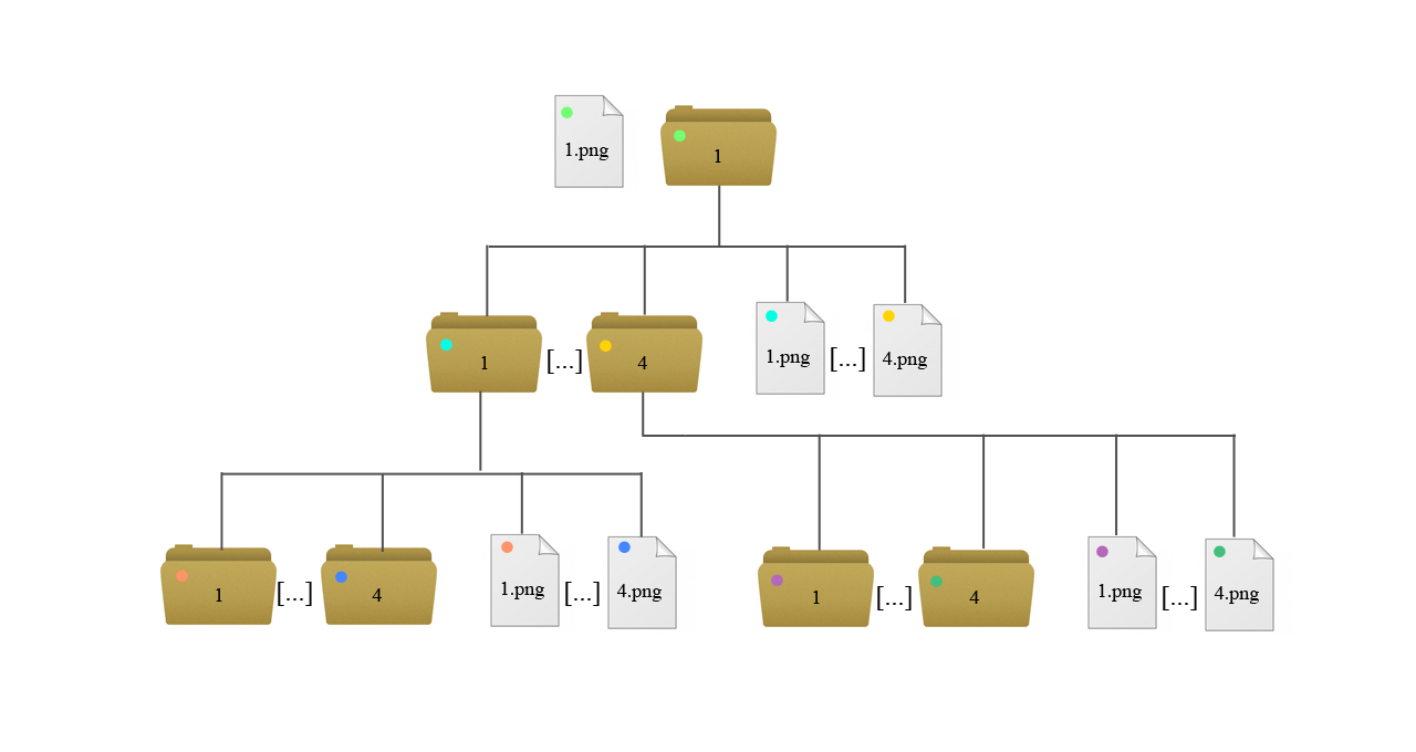 The TREE addressing-scheme is as easy as the WMTS addressing scheme. Every level in the tree defines a level of detail of the terrain. On level 0 we have an image (1.png) that represents the terrain in the worst quality. It has a folder that has its number as name (1). In this folder we find four images where all four images together represent the whole terrain. The resolution grows up every level by a factor of four. Every image has its folder that always includes four images with the next finer resolution quality. If an image has no folder, the final resolution quality has reached. The position of the images for a finer resolution is as follows: