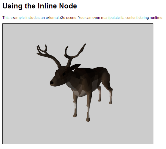 <inline nameSpaceName="Deer" mapDEFToID="true" onclick='redNose();' url="Deer.x3d" > </inline>
