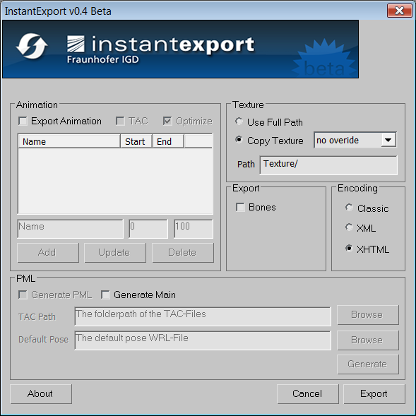 After that, the exporter GUI pops up. Here, under Encoding choose XHTML, as shown in the screenshot below. Finally, press the Export button. For more information, the zip file also includes a help file for the exporter.