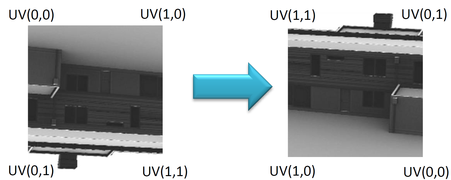 WebGL stores the rendered texture "upside-down", thus, the v-axis has to be inverted for the texture mapping. When rendering the image from the mirror's viewpoint, it is projected onto the backside of the mirroring surface. Therefore, we have to invert the u-axis as well. The resulting texture mapping is visualized in figure 2.