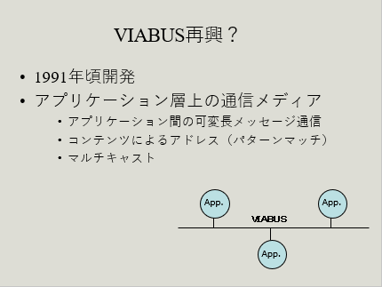そんな中で、昔にやりかけて遂げられなかったいくつかの仕事を思い出しました。その一つが、1991年頃に考えていた「viabus」です。以下は、2004年頃に行ったDeleGateのプレゼン・スライドの中の一枚です。