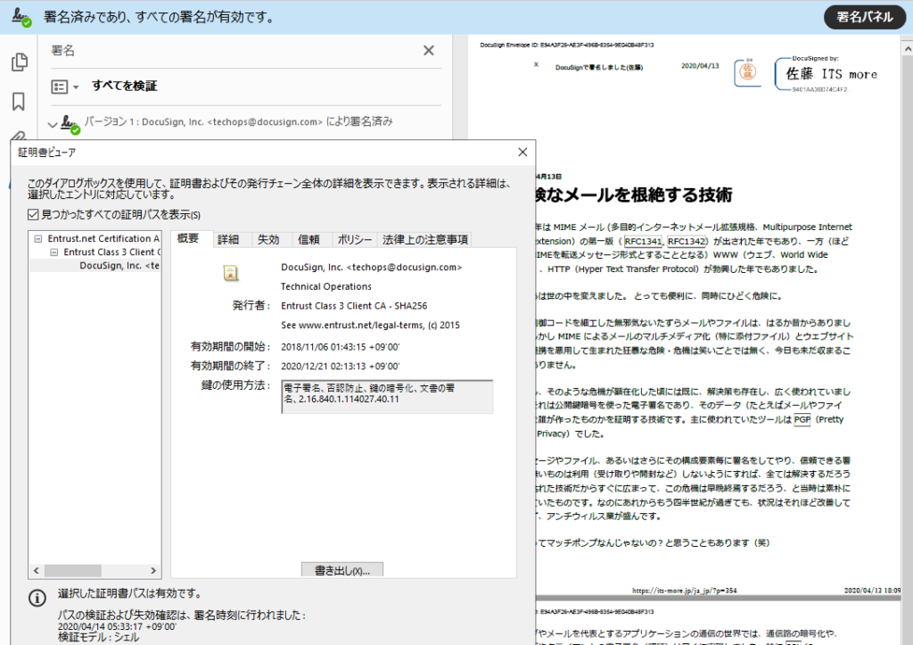 ですが、少しずつ状況は進歩し、インフラは整いつつあります。特にPDFに電子署名を行う技術はかなり普及しました。(領収書も電子署名されていると良いのに…)メールに署名する技術(特にS/MIME)も、多くのツールに実装されています。あとは、いつ大多数のエンドユーザがそれを使うようになるか、ですね。現状、電子署名用のデータをツールにインストールする作業は超カンタンではなく、素人には少し敷居が高いレベルですが、これも早晩こなれて解決するでしょう。