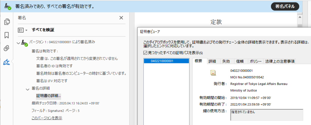 いわゆる電子定款には、公証役場の公証人さんが電子署名します。たとえば、弊社の定款PDFをAcrobatで開くと、以下のように表示されます(この場合には、署名をPDF上に重ねていません)。発行者は Registrar of Tokyo Legal Affairs Bureau, Mnistry of Justice(法務省法務局)です。わが社は東京法務局ではないですけどね。