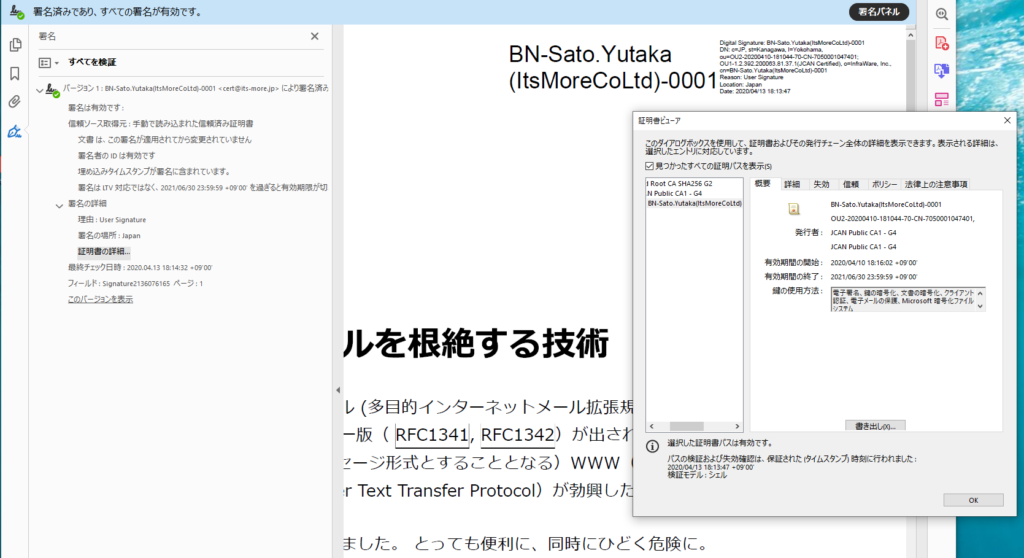 そんな中、上記の個人証明書値引きキャンペーン打っている会社では並行して、無償で手軽にタイムスタンプを押してくれるサービスを提供しています。それがキャンペーンに乗った決め手でした。たとえばこの書き物のPDF版に対する署名は、以下のファイルの右肩に表示しています。PDFのリーダで開けば、その署名が本物か確認できますが、そのためにはご自身のPDFリーダに署名者の証明書をインストールする必要があります。自動化する方法もあるようですが、一件だけなら手動でも簡単です。 めっちゃメジャーな証明書業者から買えば、Adobeが証明書をプレインストールしてくれてて、その手間もいらないのかな?高そうだけど。ちなみに、Adobe自身が提供しているタイムスタンプサービスは、とても高価です。