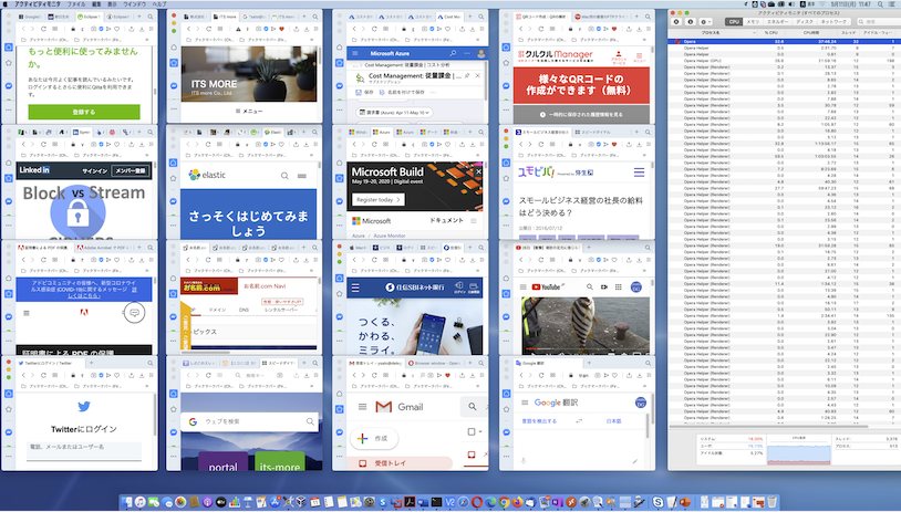 Operaの実装はたぶん1タブ/1プロセスになってますが、一プロセスはとても小さいです。Chrome時代に比べてメモリプレッシャーが低い。CPUは見た目常時100%近く食ってます(ユーザ70%、システム25%)が、プルセスの優先度が低いのでしょうか、マルチコアだし、インタラクティブな作業を邪魔する感じはほとんどありません。他にCPUバウンドなプログラムを走らせても、time コマンドは、70%程度はCPUを使えた、と報告します。