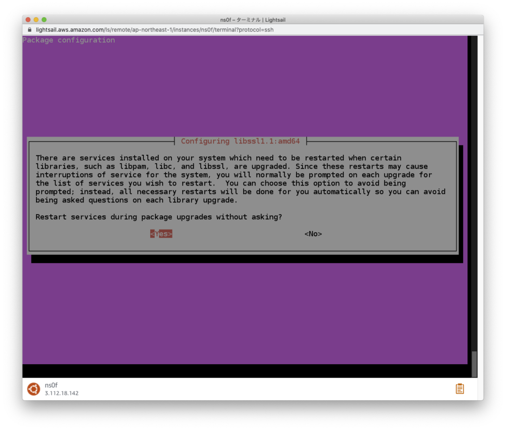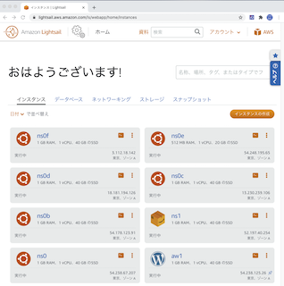 基盤:それがもう、バカみたいに簡単なんですよねw。ライトセールコンソールから、インスタンスの作成。OSのみでUbuntu選択。$5プランを選択。そして作成をぷちっと。この保留中にでる「利用不可」という表現はなんだか不吉なイメージなのでやめてほしいですね。あ、できました、実行中。1分ちょっとでしたか?で、このコンソールアイコンをクリックすると端末が開く。以上です。