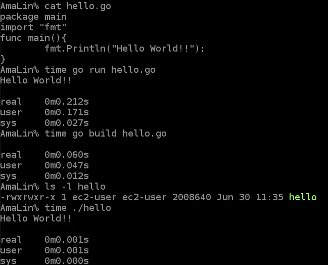 開発:aptと同じですか。じゃ sudo yum install gcc … 「Complete!」。で cc。OK。似たようなものですね。ついでに sudo yum install golang … おー、やってるやってる。Complete!。ではおもむろにHello World…