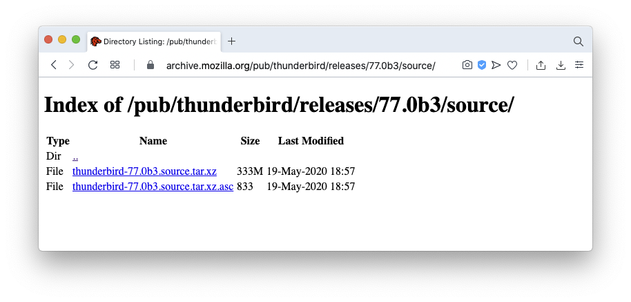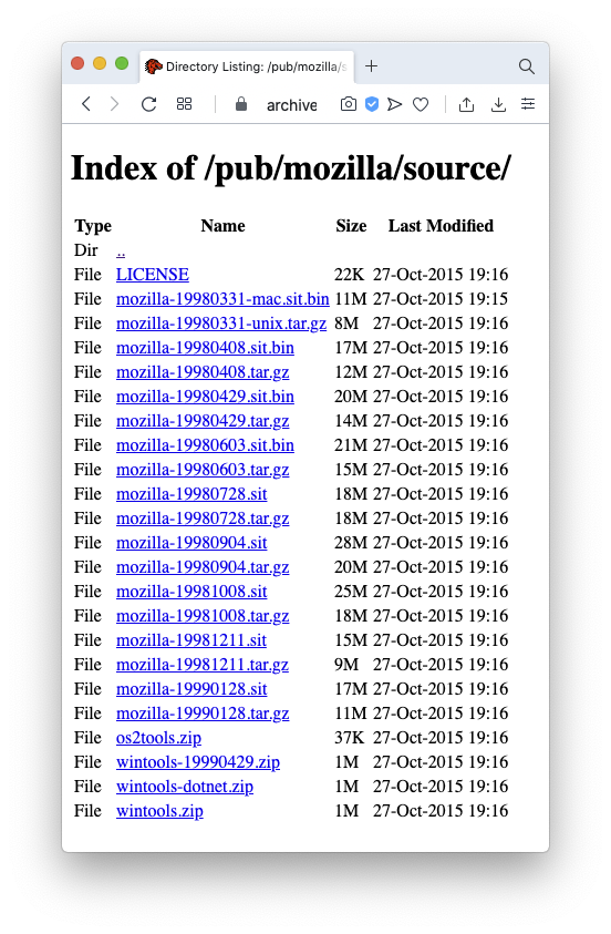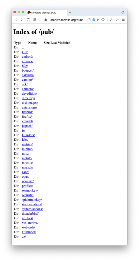 開発:それにしてもこの、Mozillaファミリーのソースの配布っていったいどういうことになってるんですかね。https://archive.mozilla.org が大元かなと思っているのですが。もうこういう寂しさ満点の景色でして。