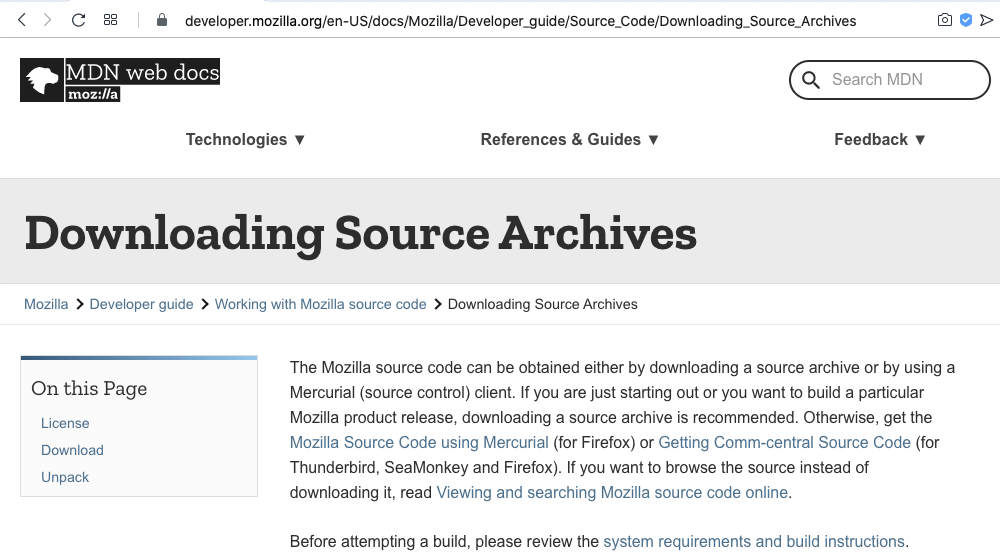 The Mozilla source code can be obtained either by downloading a source archive or by using a Mercurial (source control) client. If you are just starting out or you want to build a particular Mozilla product release, downloading a source archive is recommended. Otherwise, get the Mozilla Source Code using Mercurial (for Firefox) or Getting Comm-central Source Code (for Thunderbird, SeaMonkey and Firefox). If you want to browse the source instead of downloading it, read Viewing and searching Mozilla source code online.