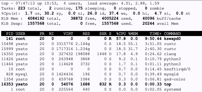 基盤:まあ、やり直しましょう。・・・んー、最後のところすげー重いですね。top で見ると・・・load average 4。めっちゃスワップしてます。