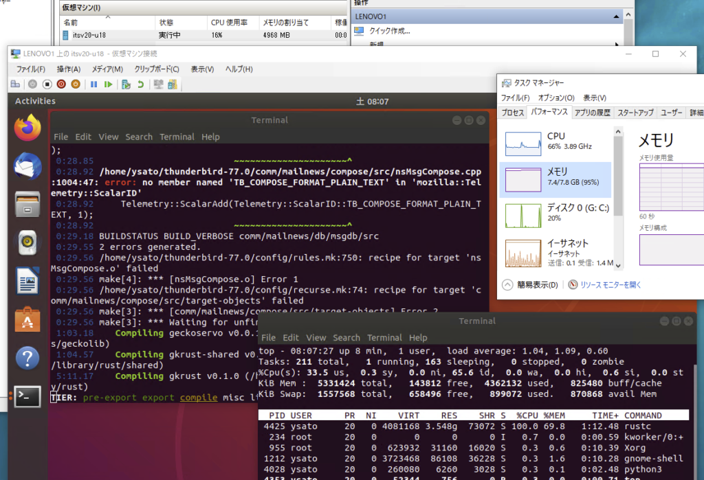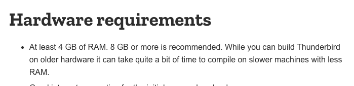 開発:あー、Thunderbirdのビルドのページの先頭にこう書いてありました。4ギガではギリかもですね。