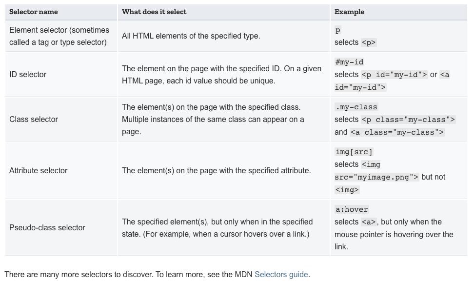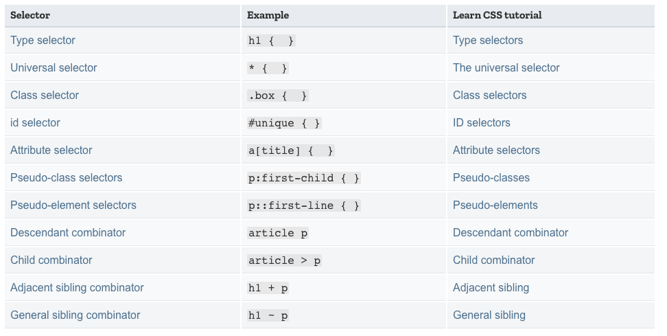 開発:あ、それはそうと、わたしはさっきはじめて、CSSの基本中の基本というページを見たのですが、この selector に関するテーブルはまさに、ああこういうものを見たかった、というサマリーでした。