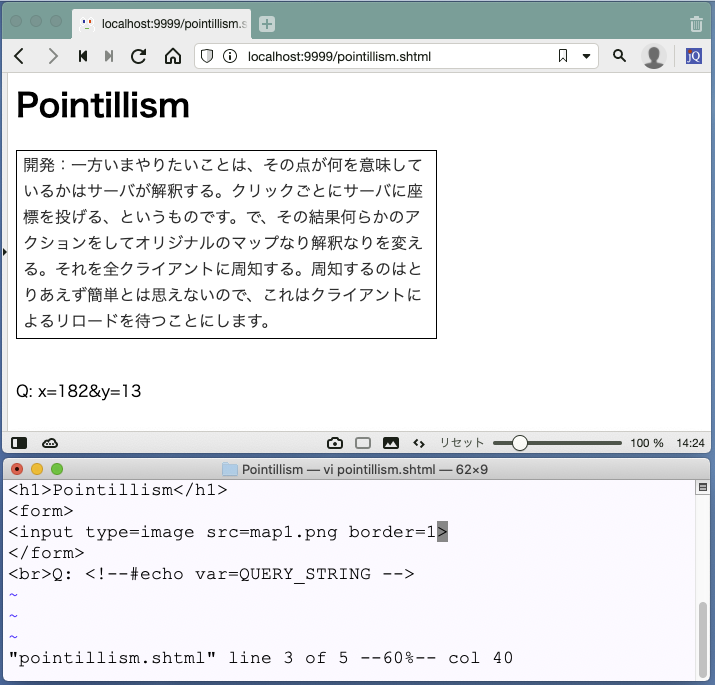 開発:というところで引っかかってしまったのですが、何のことはない、type=subumit とか type=button と同じように、type=image と書けば良いのだということがわかりました。なので、点描.click の最初の一歩はこれです。単なるクリッカブルマップですが(笑)