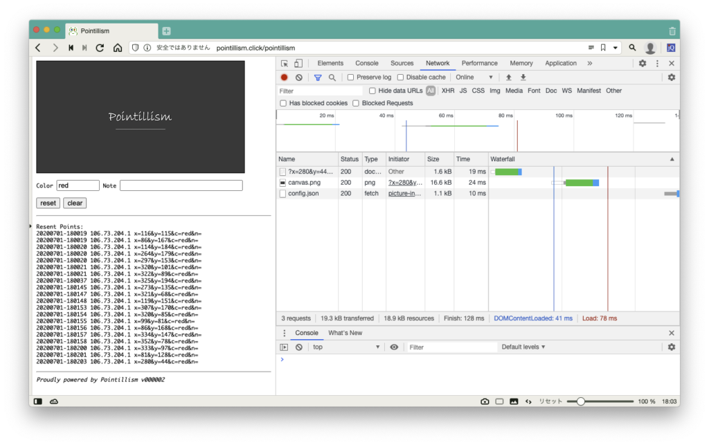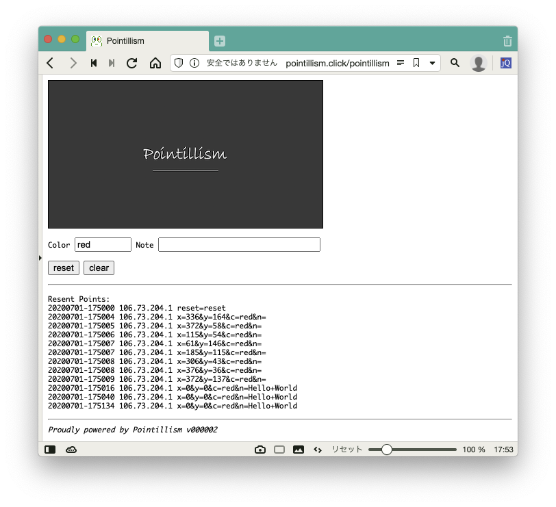 開発:それで次にやりたいのは、複数のクライアントからパラパラとやってくるクリック情報を集積して全員に見えるようにすること、あと単に座標だけでなく何かの属性情報も受け取って集積したい。どこに集積するかと言うと、これはmethodがGETであれば、単にHTTPのアクセスログでも良いです。ただ、このページだけのログが、永続的なものとして欲しい。