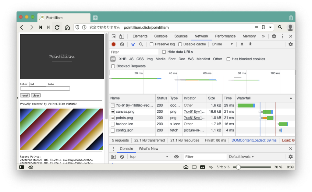 開発:あと、PNGは赤い点ばかりなので圧縮が効くのでしょう、200点でも1KB程度です。ですがいずれ、区画ごとにPNGを分けた版を作るとか、分けて生成して結合することも必要と思います。