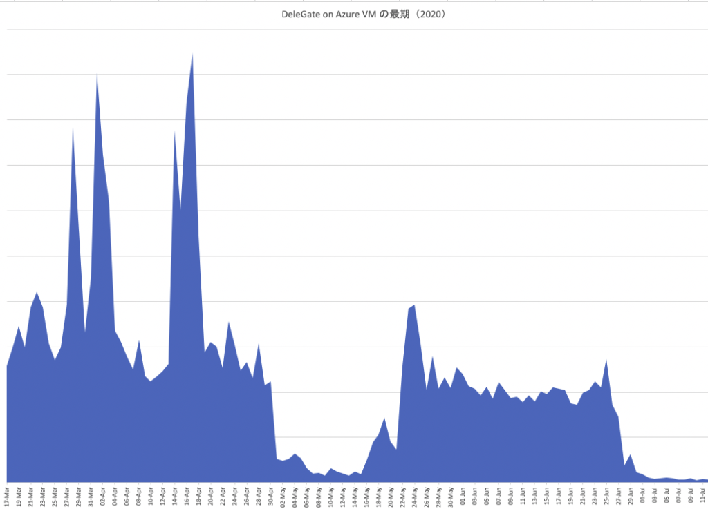 開発:こうして見ると、4月30日にサーバを引き継いでドメインを delegate9.org へ変更した後はがっくりとアクセスが減って、delegate.org を復活した5月中旬からほぼ復旧したという感じですね。