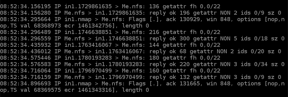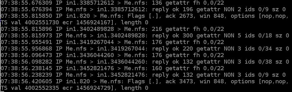 基盤:ふぁあ。よく寝た。さてまず、NFSのパケットを覗いてみましょう。tcpdump あれ、ないんですね。yum install tcpdump。あった。では。クライアント側で echo > x。