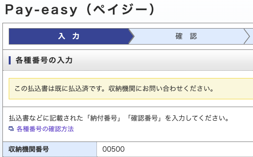 経理:納付番号を再発行して、電話で教えてくれるそうですが、システムへの登録処理に1時間くらいかかるかもとのことです。あと、形式上郵送版も来るそうですが、ペイジーで払った場合には破棄して下さいと。