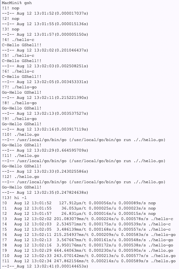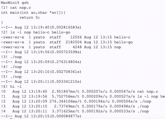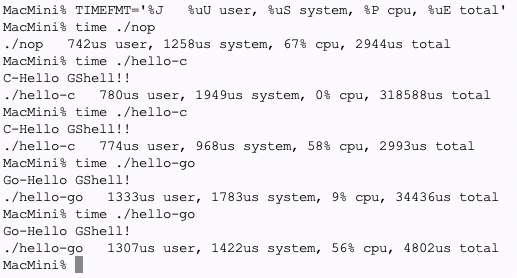 開発:CPUを一ミリ秒も食ってないのに起動・終了に3ミリ秒かかってしまっているのは、GShellの ForkExecとWaitのせいかも知れません。