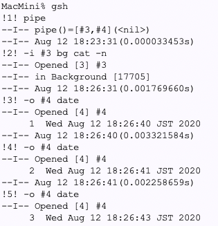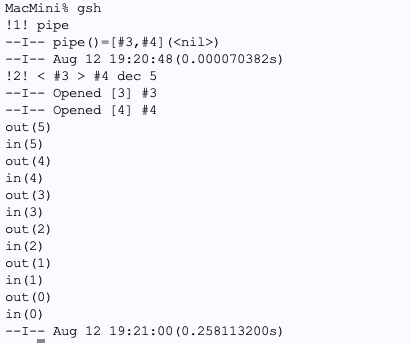 開発:それで、今朝方やってたパイプ関係の話ですが。プリミティブ的には、pipeを作る。pipeを入力とするプロセスを生成する。pipeを出力とするプロセスを生成する。これだけだと思います。