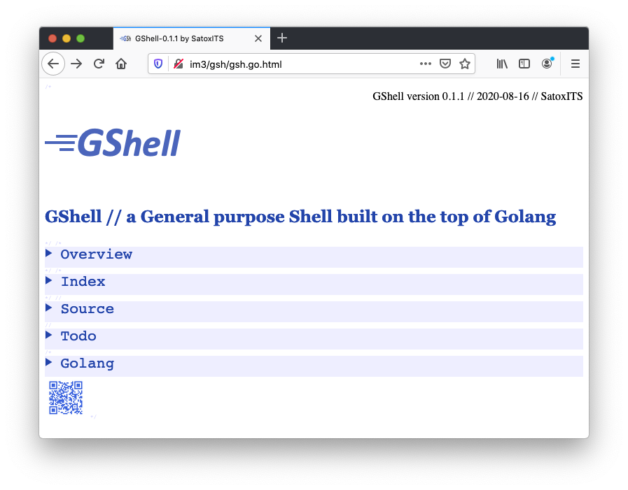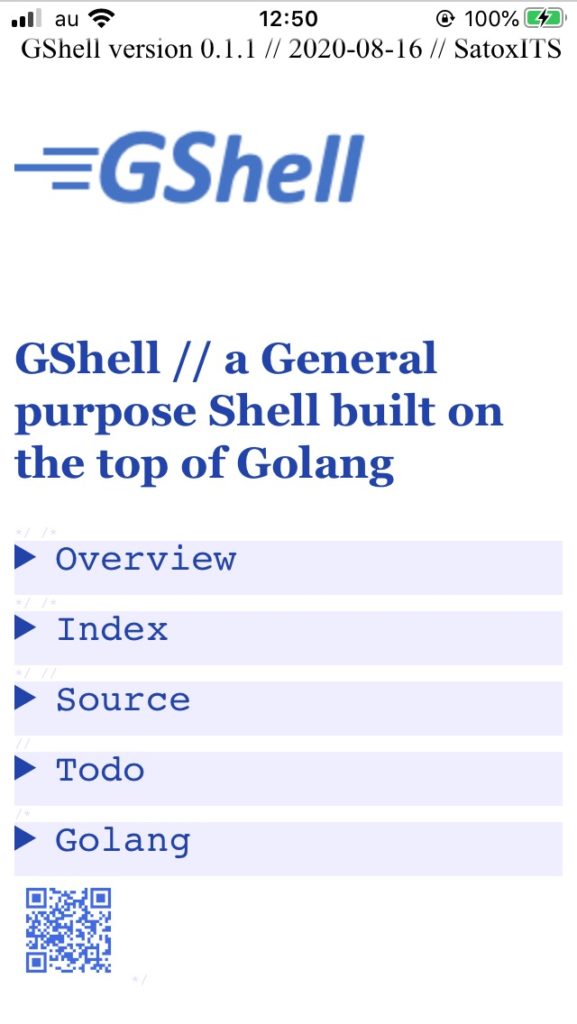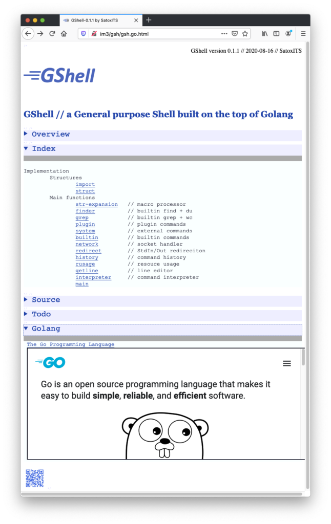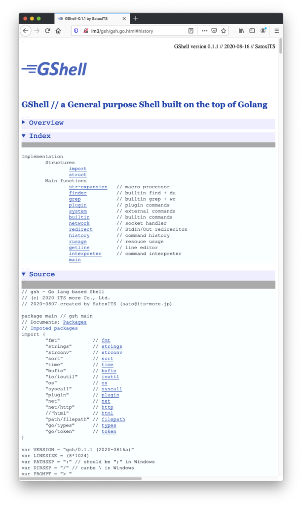 開発:gsh.go は、ソースコード兼、ホームページ兼、ドキュメント兼、…です。Go言語に従っていますが、HTMLでもあります。拡張子を変えると見え方が変わります。たとえばスマホで見るとこう。