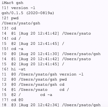 開発:N番目のコマンドを実行した時のディレクトリという参照もしたいので、これを !Nd というにすることにしました。一方、N番目のディレクトリに居た時に何をやったかを見たいことも多いので、これは history @N で表示できるようにしました。