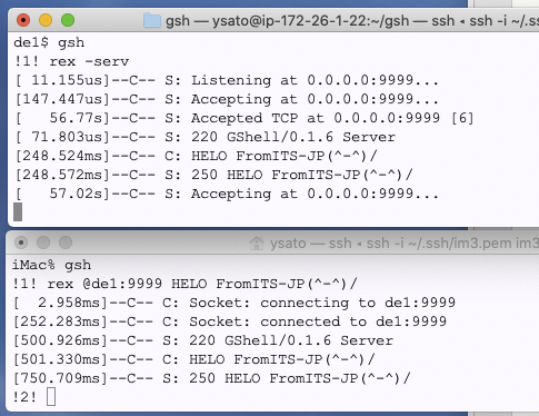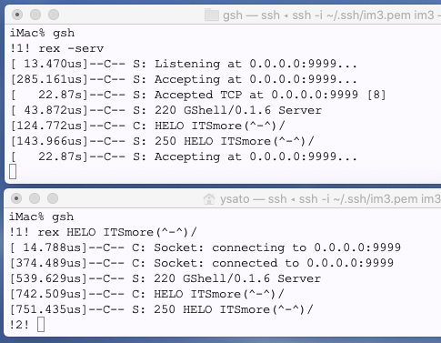 開発:まずは、隣で動いてる GShell にちょっかいを掛けてコマンドを送って結果を得るということろだと思います。rexecですね。これはこないだウェブブラウザからHTTPでちょっかい掛けたのと大して違いません。ただし、結果は標準入出力というストリームだけでなく、実行結果のメタ情報的な標準結果出力的なものも得る。