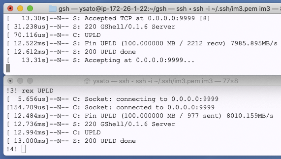 開発:では刹那的に、100MBのデータをサーバに向けて送信するコマンド、UPLDを作りました。まずはホスト内での転送。
