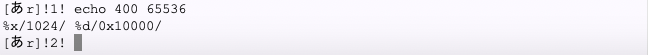 開発:移植作業でちょっと疲れてしまったので、簡単なのを一つだけ作りました。イツモ不便に思っていた 10進 / 16進変換支援です。%x/数値/ とすると数値が16進に、%d/数値/ とすると10進に変換されます。こんな感じ。まず入力をして。