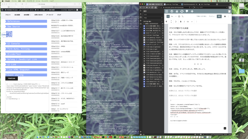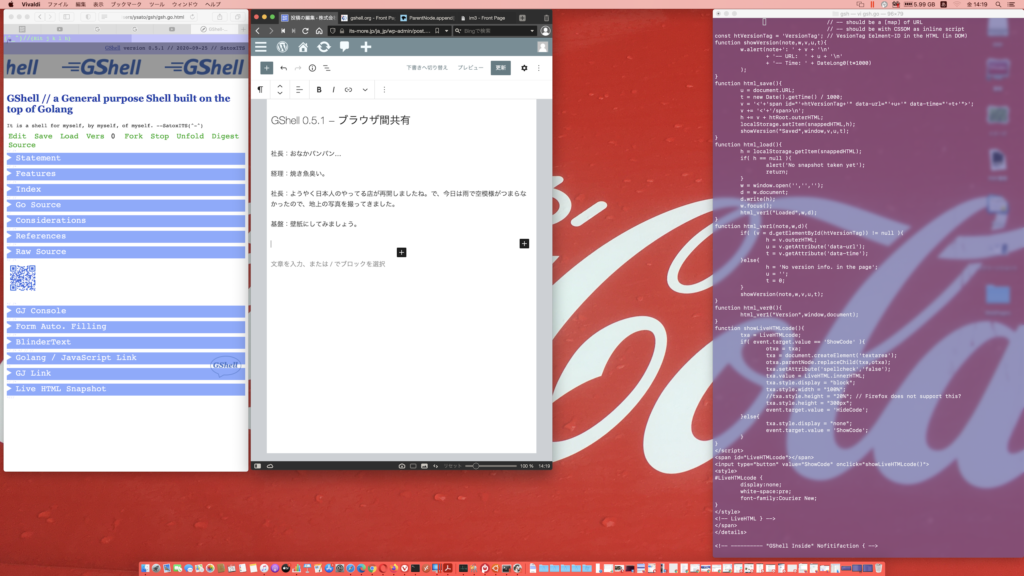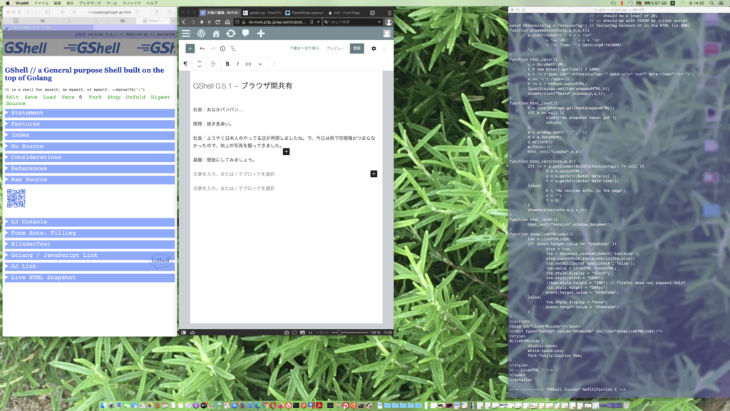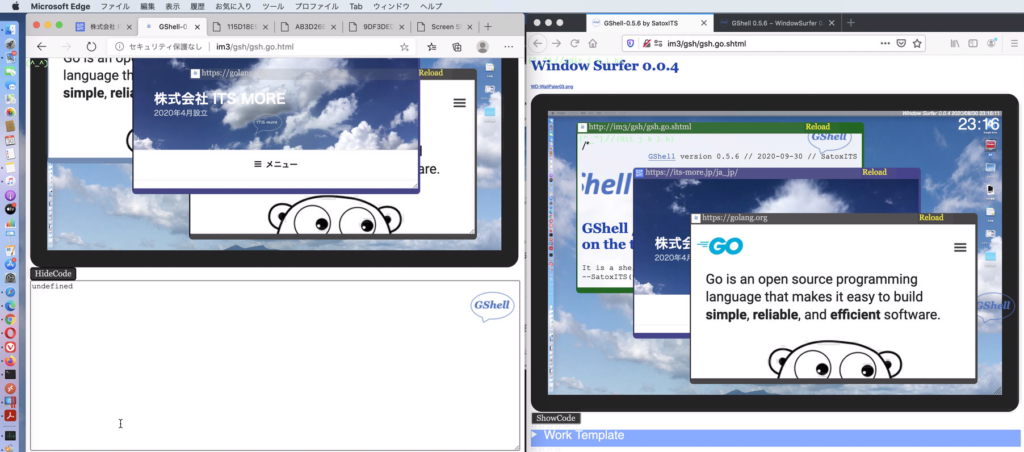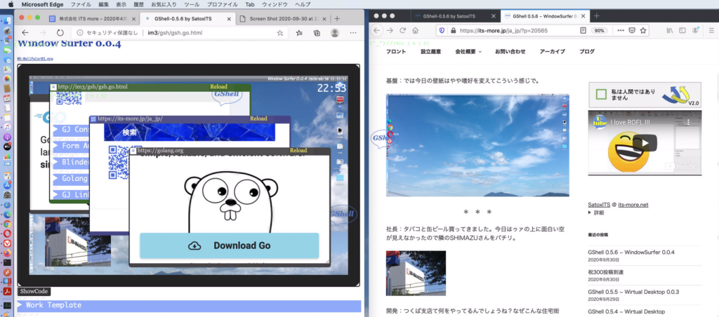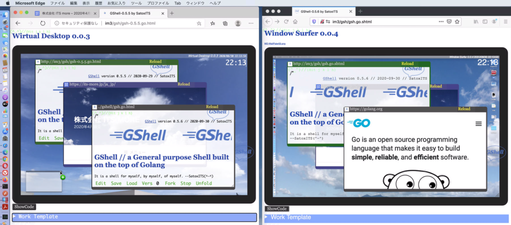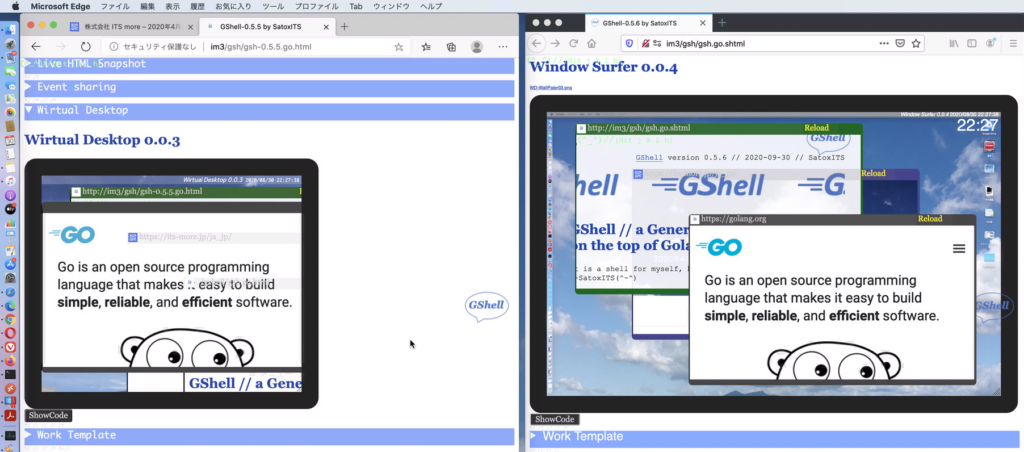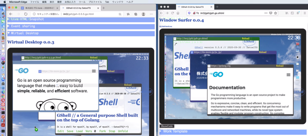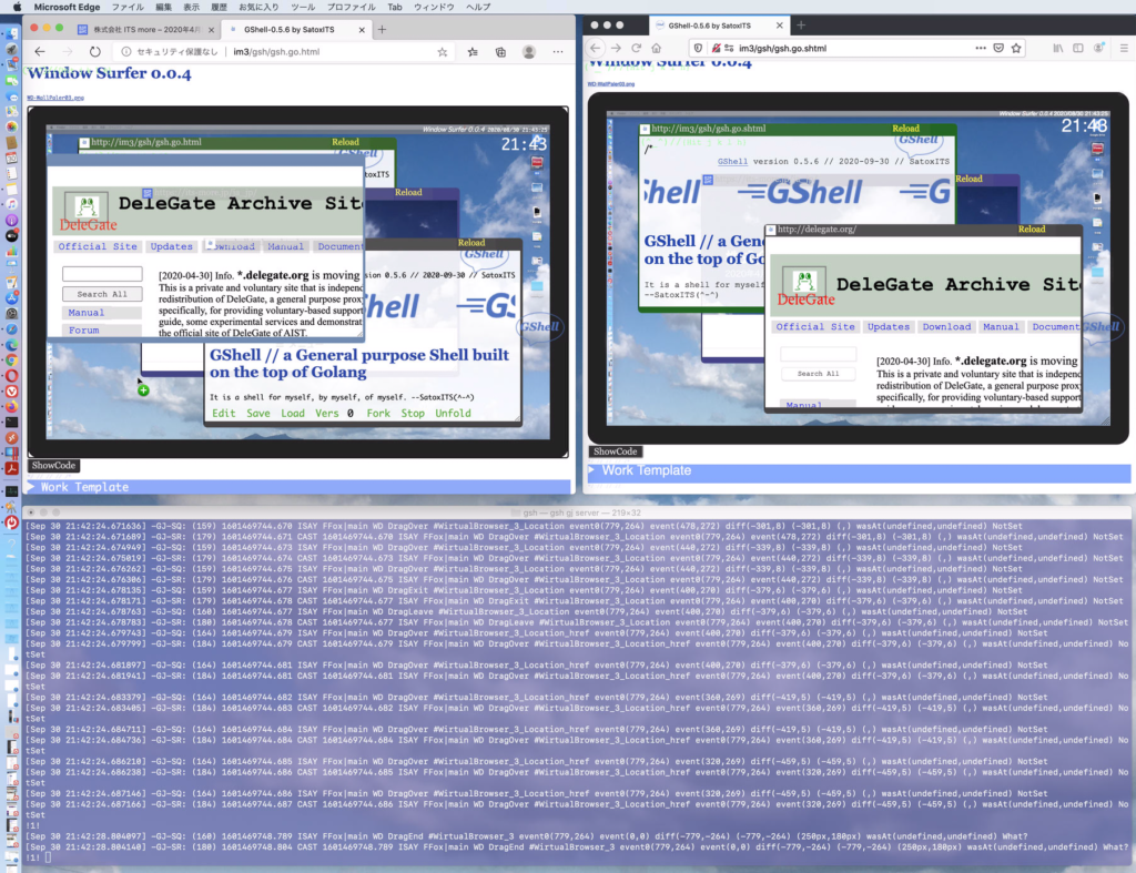 開発:左上が移転先と想定するEdge、右上が移転元のFireFox、下がGJ LinkサーバーのGShellの画面です。右上で何気にDeleGateのホームページをWirtual Browserで開いて、ドラッグして左上のEdgeの中の Wirtual Desktopにドロップしたら、コピーされて動いてしましました。