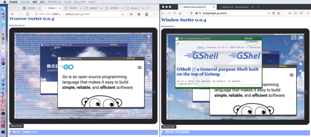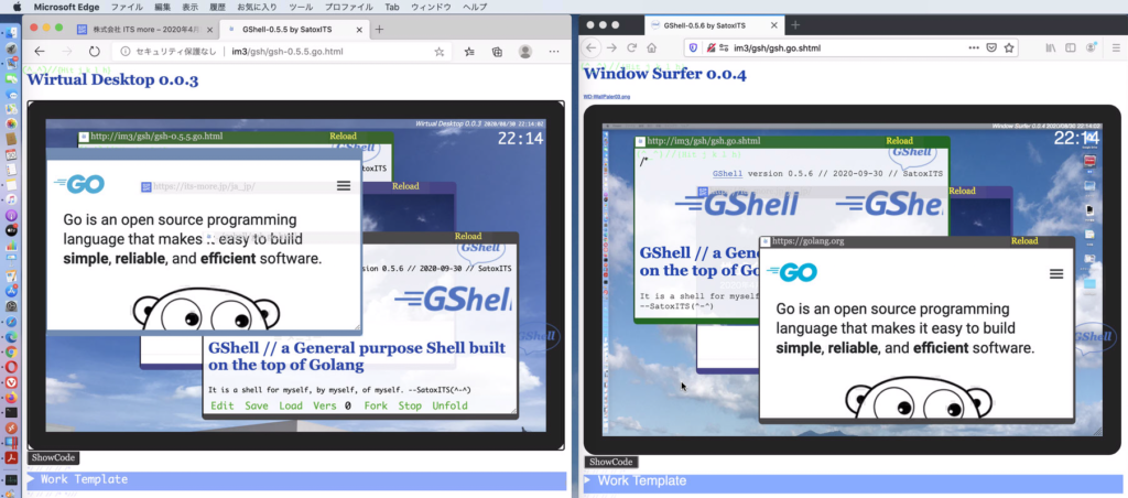 開発:確認のため、GJ Linkは落としてます。で、ドロップ先のEdgeは、昨日版のWirtual Desktop 0.0.3にします。で、右のFirefoxでGolang のトップページを開いて、左のEdgeにドラッグ。