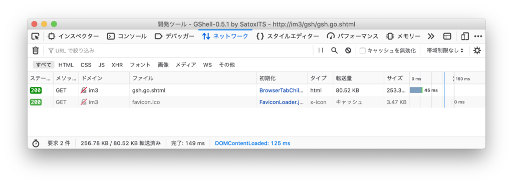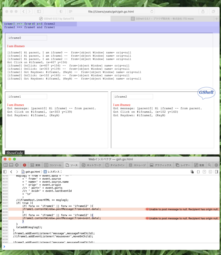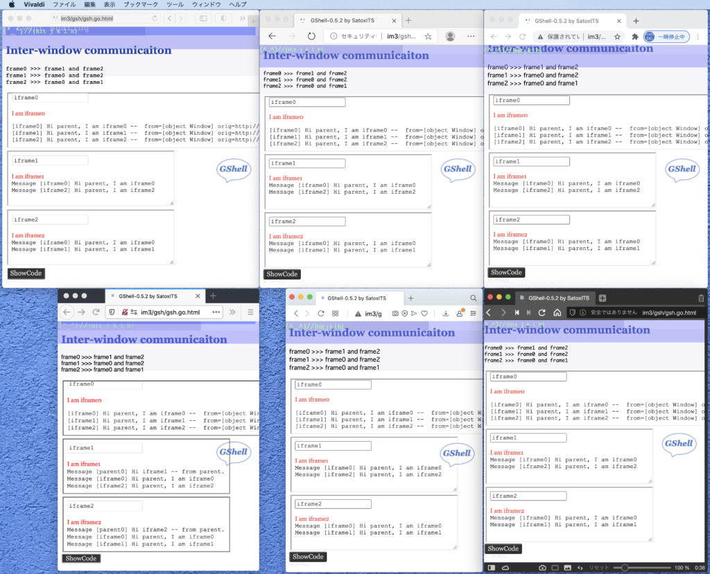 開発:ではまず準備。これはログを見ながらでないと効率が悪いのですが、各ブラウザごとにログ窓を開いて見比べるのが面倒で仕方がありません。気が乗らない原因の一つです。それで、ログは GJ Link に投げて、一箇所で見れるようにします。