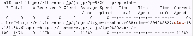 基盤:うーん。timeの値とclntのアドレスはセットなので、その時間にそのクライアントがアクセスした時に生成されたデータである、とうことは同定できてると思うんですよね。だから、うちがその時にアクセスした時に出来たページ(ImRobotフック)をbotが見ている。なぜなのか。