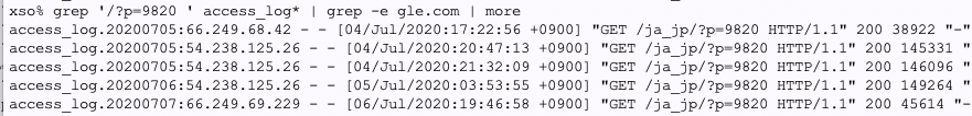 106.73.xxx.xxx - - [05/Jul/2020:00:58:01 +0900] "GET /ja_jp/?p=9820 HTTP/2.0" 200 45233 "https://its-more.jp/ja_jp/?p=9975" "Mozilla/5.0 (Macintosh; Intel Mac OS X 10_15_5) AppleWebKit/537.36 (KHTML, like Gecko) Chrome/83.0.4103.98 Safari/537.36" "-"