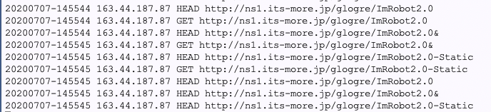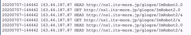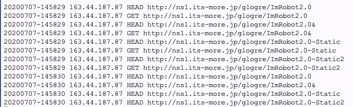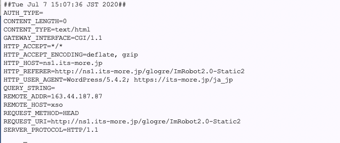 開発:時系列を推測すると、このページ(p=10343)に bot が気づいてフェッチした、その中にあった p=9820 のリンクをたぐった、さらにその中にあったImRobotフックにかかったという事かと思うので、昔のキャッシュというのはちょっと無いように思われます。このtimeって… ftime '%Y%m%d-%H%M%S' 1593878281 ... 20200705-005801 ですね。