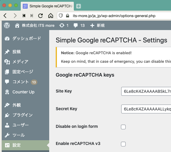 基盤:いつからなのか、当社サイトの reCAPTCHA が居なくなっていましたので、先程新調して再招致しました。もっとも、設定しようとしたらもともとのキーが空欄だったので、何かの手違いで私が削除してしまったのか知れません。