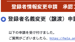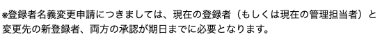 基盤:「登録者名義変更申請前に管理担当者情報を変更」が必要だった模様。では管理担当者情報を変更…