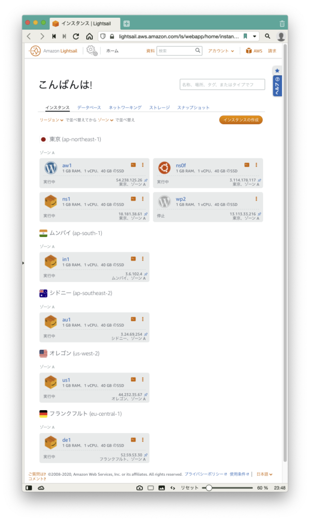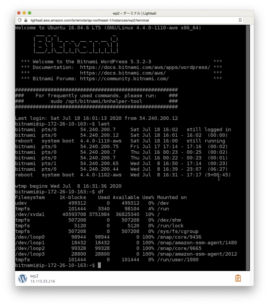 基盤:ああそれで、東京リージョンにある4機のうち、今後継続するのはAmazon Linuxの ns1 のみ。初代 ns の ns0f Ubuntuは、ログデータ回収後廃棄します。wp2 はWordPress / Bibtnami / Ubuntu16ですが、これも試しに作っただけのものなので廃棄します。あ、いまやっちゃいましょう。