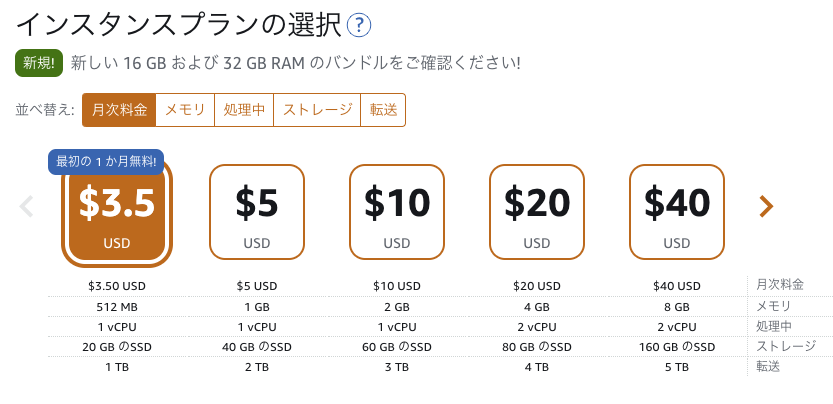 基盤:CPUとストレージは最低限の動作のために削れないから、安いプランでもそこそこある。$5がいかにお得かということがわかります。$20以上は激安とは言えない。$10と$5では、RAMが1GBで足りるサーバであれば$5を2台のほうがお得。まあ、純粋にDNSサーバだけやるなら$3.5でも十分だとは思います。