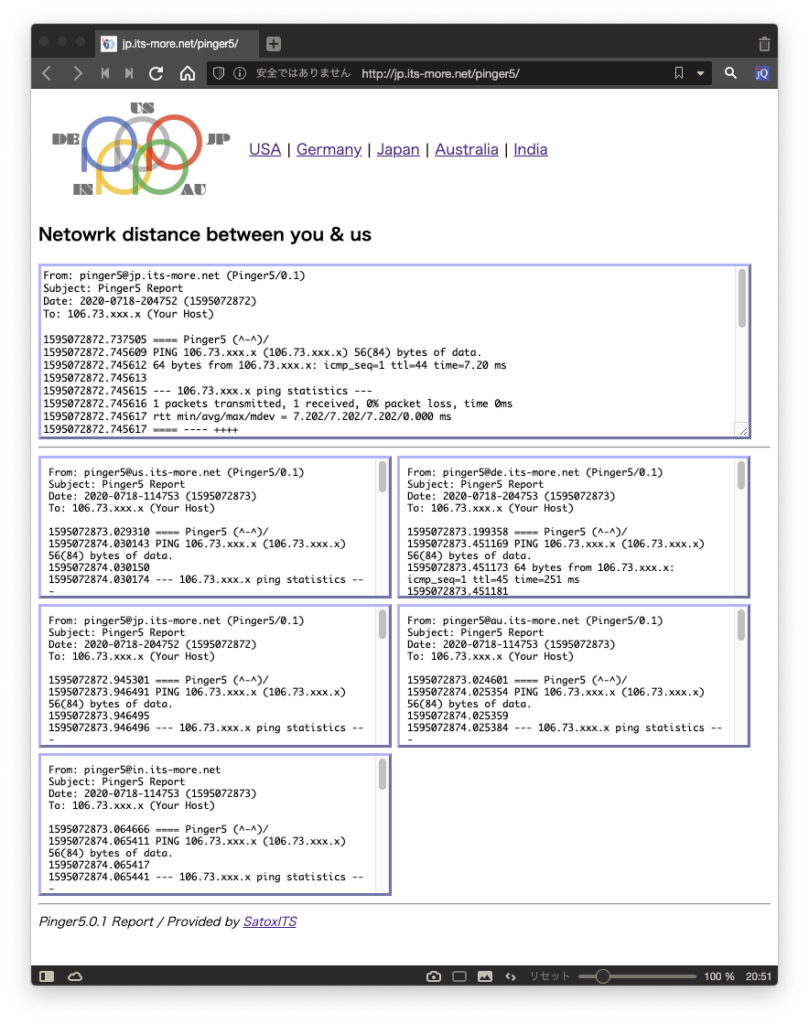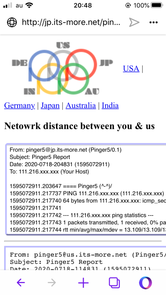 開発:たぶん。これは大家さんの100MBps回線です。WiFi切って4G接続にするとpingが来ませんね。まあそりゃそうかな。
