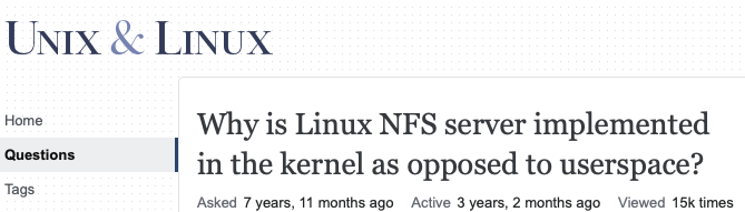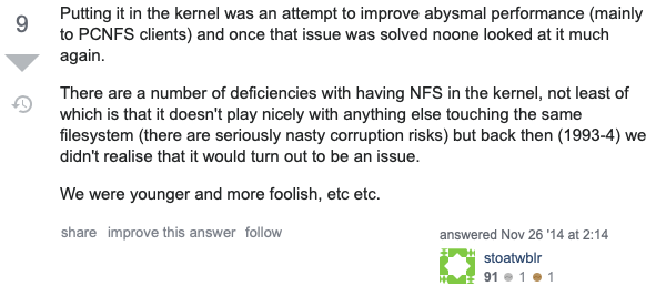 開発:nfsサーバをカーネルに取り込んだのは性能向上のためだったが、多くの問題を生んだ。今は反省している、みたいな流れですね。