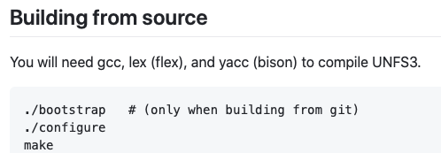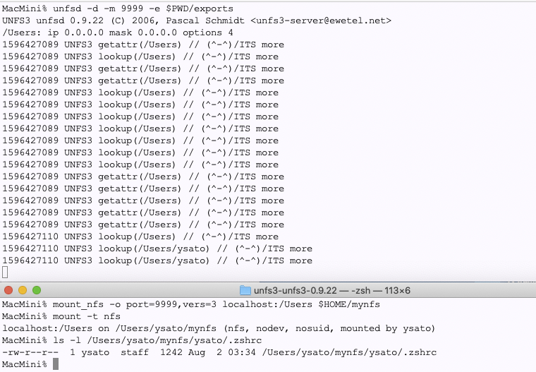 開発:で両方ともダウンロードして眺めたのですが、これはもうひと目見てunfs3で決まりです。めっちゃ簡単。名前のとおりNFSv3ですが、まあクライアントがそれで許してくれるなら問題ないでしょう。