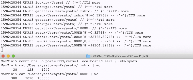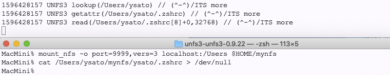 開発:リブートしてからすごく快調で、diskutil なしの umount も普通に通るようになってしまいました。最初 / を export してマウントしたのが問題なのか、今はまだクラウドのドライブがほとんどマウントされてない関係なのか、よくわかりません。というか、unfsd 自体が出していると思っていた :/: の response が無いというようなエラーメッセージ、あーキャプチャし忘れました、MacOSのライブラリが出していたのかもしれません。strings unfsd しても出てこないんです。