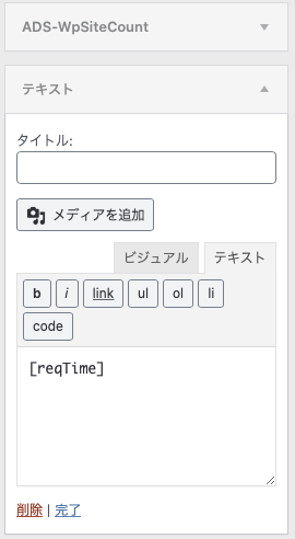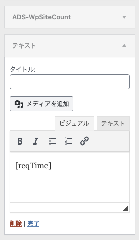 開発:とりあえず。というか、ヒト可読性が低いほうが良いこともあるかと。で、これをサードバーに入れるには… あれ? とうか、このカウンターをブロックで埋め込むショートコードはわかっているのです。表示オプションとか全部デフォルトで良いなら単に、[ ] の中に ads-wpsitecount と書けば良い。するとこうなる。