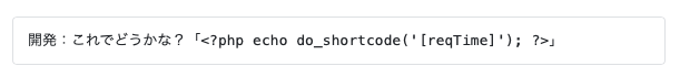 開発:ああ、reqTimeというショートコードを作ってますね。ではこれをそのまま使用します。ブロックの中でならこう。