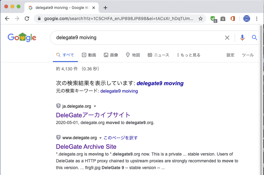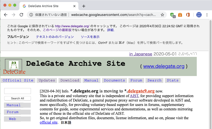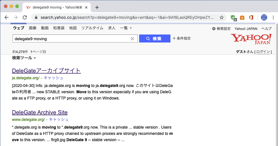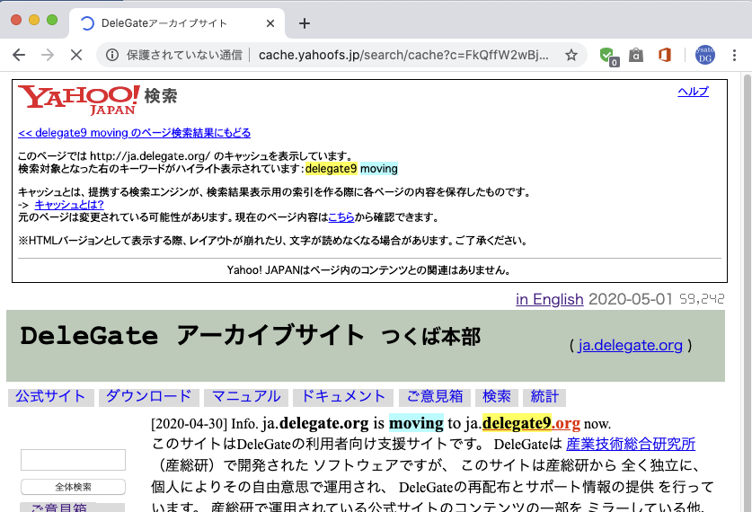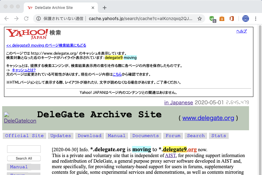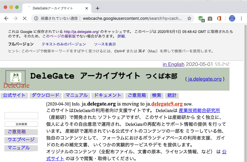 無駄な出費を一刻も早く止めるべく、delegate.org の旧サーバを停止しました。新ドメイン delegate9.org への引っ越し案内が Google と Yahoo の検索でヒットするようになったので、もういいかなと。Google のキャッシュでは以下のように表示されます。よい卒業記念写真になりました。